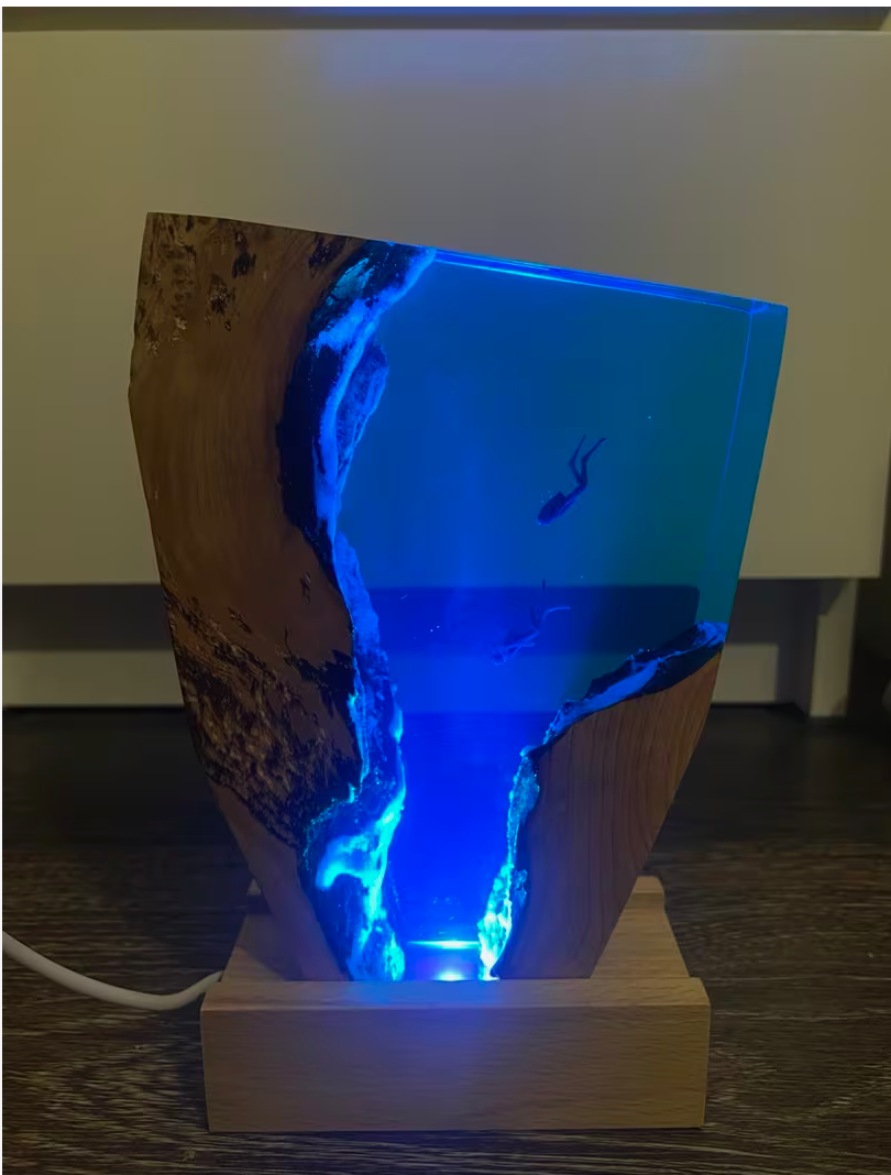 Jedes Stück ist eine Miniatur-Meereslandschaft — rollende Wellen, tiefes Blau und weiße Gischt, eingefangen in kristallklarem Resin auf einem Sockel mit integrierter LED. Schalten Sie das Licht ein und die gesamte Szene erstrahlt von innen heraus. Kleine Chargen. Keine Abkürzungen. Gemacht für alle, die das Meer lieben.